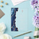 The left-hand edge of this elegant modern first communion invitation features a navy blue watercolor agate border trimmed with faux rose gold glitter. A faux rose gold foil cross appears above the customizable text, which combines pale pink handwriting script, copperplate and italic fonts on your choice of a clear or frosted background.