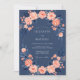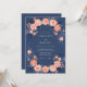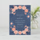 This design showcases a deep navy blue background paired with a vibrant arrangement of peach and coral roses. The dark blue foliage creates a moody and sophisticated botanical aesthetic suitable for winter or formal ceremonies. Soft watercolor details and blooming floral elements provide a romantic and timeless look. The rich palette and floral accents evoke an atmosphere of elegance.