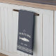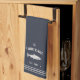 Customize your kitchen with this cute personalized towel featuring your family name or house name and year established in soft ivory lettering accented with a fish illustration on a navy blue background.