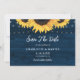 Personalized navy blue rustic wood and sunflower wedding save the date cards featuring sunflower flowers on a rustic wood background. Two burlap hearts at the back. Matching items available.