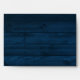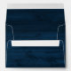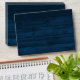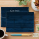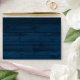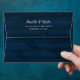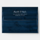 Custom navy blue rustic country wedding envelopes with a return address on a barn wood background.