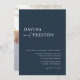 Photo wedding invitation featuring your names in elegant serif bold font with "and" and "reception to follow" in modern handwritten script lettering over an elegant Navy Blue background. Personalize with your wedding details beneath.