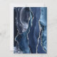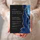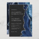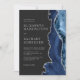 The right edge of this elegant modern wedding invitation features a navy blue watercolor agate border trimmed with faux silver glitter. The customizable text combines silver grey serif, copperplate and italic fonts on a slate black background. The reverse side features a matching navy blue and silver agate design.