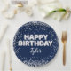 Navy blue and silver birthday party paper plates for a fun party with a modern classic look with glitter and foil balloons on personalized paper plates.