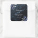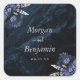 These elegant wedding stickers feature the couple's names in silver gray italics, joined by word "and" in silver gray handwriting calligraphy with swashes at the beginning and end. Add the wedding date below in serif font. A pair of navy blue floral bouquets set off with silver faux foil foliage appear in two corners, on a background image of dark navy blue watercolor agate. See our collection for matching wedding invitation suite and day-of stationery.
