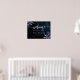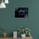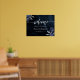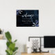 The corners of this elegant wedding poster are decorated bouquets of navy flowers trimmed with silver faux foil foliage. Customize the text in silver gray handwriting script and serif fonts on a navy blue watercolor agate background.
