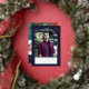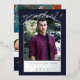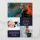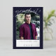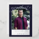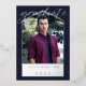 Elegant navy blue and silver graduation invitation personalized with one photo on the cover and three more photo on the back. Double sided graduation invitation printed with silver foil against a navy blue background with the graduate's photo in a silver frame. 2 in 1 graduation announcement and invitation personalized with photos and the graduate's name on silver foil.