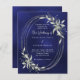 A blue, uneven coloured background. An oval faux silver frame decorated with sage green greenery. Personalize and add your names, details. Black text.