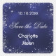 A Save the Date sticker for your wedding. A navy blue background, white text. The blue colour is uneven. Decorated with faux silver sparkles. Personalize and add your names and wedding date.