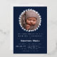 Silver foil and navy blue naming ceremony invitation with a photo of your baby inside a simple silver wreath. Photo naming ceremony invitation in silver and navy blue with a charming leafy wreath.