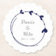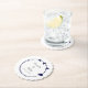 Set of 6 round, absorbent, pulp board drink coasters for wedding showers, wedding receptions, and even rehearsal dinners that feature a trendy, navy blue colour, simple heart wreath design along with the bride and groom names and wedding date printed in dark grey, stylized lettering. Edit and replace names and date with your own.