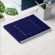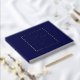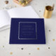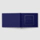 Solid navy blue colour, simple wedding guest book with stylized foil print within a square border that features the bride and groom's name along with wedding date in your choice of colour foil print. Seen here in silver foil print. Select your guest book style.