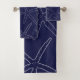 This bathroom towel set features a white illustrated line pattern of starfish and sand dollars. The background is navy blue, but can be changed to any colour of your choice. Perfect for beachy, coastal or nautical theme decor.