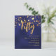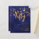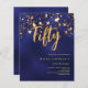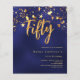 A modern, stylish invitation for a 50th birthday party for both him and her. Decorated with golden stars. Navy blue background and the word Fifty written with large faux gold letters. The blue colour is uneven. Personalize and add a name and party details.