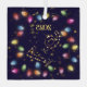 Gold stars over a gnavy blue background, surrounded by a string of Christmas lights.
