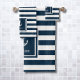 An elegant personalized nautical design towel set featuring an anchor and navy blue and white striped pattern with your boat name set in a navy blue-bordered square. Designed by Thisisnotme©