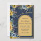 This stunning wedding invitation features a navy blue background with luscious sunflowers and surrounded by lighter blue flower and greenery. Gold lettering and touches of calligraphy are a perfect accompaniment to the beautiful flowers. A lovely design choice to set the tone for your wedding celebration. There are card variations and a matching envelope. For any design question or additional customization and / or matching items, just send an email to charmdesignstudio@rcn.com and we'll be delighted to assist.