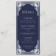 The menu has a vintage faux silver frame. The title "Menu" and the subtitles are written in caps. All text can be personalized and has a grey colour similar to the frame. The background is navy blue. On the back, there is the same vintage frame.