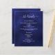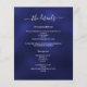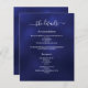 A modern, elegant wedding program/details/timeline. A navy blue coloured background. The blue colour is uneven. Personalize and add your names and wedding details. White coloured letters.