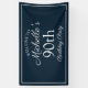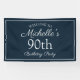 Navy blue and white custom 90th birthday party banner for a woman's celebration. Text is an elegant calligraphy script font. Contact us for help with customization or to request matching products.