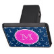 A preppy, nautical, navy blue and white anchor pattern with your initial in a modern font, on a hot pink circle label, banner, frame with white circular lines border. GraphicsByMimi© Trendy, stylish, modern, cute anchors pattern you can personalize with your monogram for her. Use the template field to add your monogram initial or letter or select “customize it” for more editing options like adding your name, text or photo to make your own, unique, personalized, one-of-a-kind custom design. Other colours available.