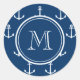 Navy Blue White Anchors Pattern, Your Monogram Classic Round Sticker
