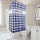 Add a classic accent to your bathroom with a custom shower curtain featuring navy blue, white, and light blue squares in a bold buffalo plaid with your family name in a rustic script font within a white band near the top. Add your own surname or text in the sidebar.