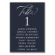 Elegant white calligraphy "table", with guest names listed and table number, wedding table number seating chart card. Background colour shown in navy blue, can be customized.