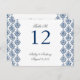 Use the personalize option to change the table number on these elegant navy blue and white damask arabesque table cards. Please NOTE: You MUST change the table number on each card and add one of each number to your cart. If you want to do more extensive changes including changing the font, font colour, or font size use the customize option.