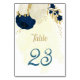 Romantic navy blue & white flowers with gold leaves botanical wedding table number card.