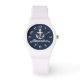 Add a name or text to this bright, fresh and modern nautical maritime anchor in bright white, on a dark navy blue with some plank wood-look background. A nice gift for the sailor or boat enthusiast.