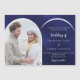 A navy blue background, photo arch wedding invitation. The blue background i uneven. White text.