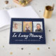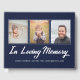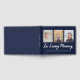 Memorial service guest book in navy blue printed with three photos of your loved one. Personalize by writing their name and years living. In loving memory is written in a handsome white font.