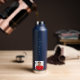 White text printed on a navy blue bottle. Personalize and add your name and a profile photo.