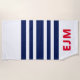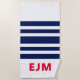 Navy Blue White Stripe Personalized Red Monogram Beach Towel