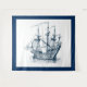 Elegant navy-blue vintage wind-sailing nautical boat illustration on white. Blue optional border.