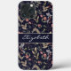 Navy Blue Woodland Botanical Pattern iPhone 13 Pro Max Case. This design features nature woodland forest rabbit, bird, pink floral and leaves pattern on a dark navy blue background. Personalize it with your name.