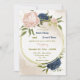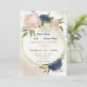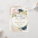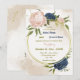 Beautiful wedding invitation featuring navy and blush pink flowers and green leaves on an elegant gold circle.