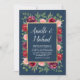 Navy Blush Pink Gold Burgundy Wedding Invitations - feature a mixture of roses, peonies and other watercolor flowers in shades of marsala, plum purple, burgundy and blush pink over a navy blue background.