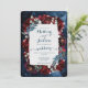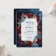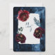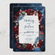 Sumptuous red peonies against a dark deep navy blue watercolor background delight alongside silver eucalyptus greenery and sprays of delicate floral artistry. Announce your wedding in a stylish modern invitation with a handwritten swashed calligraphy font on a deckled-edge watercolor paper.