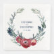 A watercolor painted blue juniper branch, eucalyptus leaf and wild burgundy red roses and navy blue berries wreath set the tone for this elegant winter wedding with your names and numeric date in a rustic block lettering.