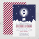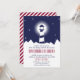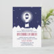 Nautical wedding invitation in navy blue and crimson featuring an illustration of a lighthouse at night against a starry sky.