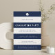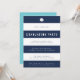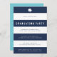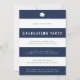 Bright and festive graduation party invitation features wide navy blue and white stripes with a grad cap illustration and "graduation party" in white cutout typography. Cards reverse to solid aqua for a bright pop of colour.