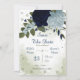 beautiful romantic navy and dusty blue flowers and green leaves botanical greenery save the date invitation