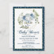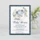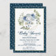 Watercolor elephant in navy blue and grey surrounded by gold-look geometric prism with eucalyptus foliage over navy blue polka-dot background baby shower invitation card design.