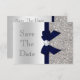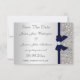 Cartes de notification de mariage personnalisées. Élégantes cartes "Save The Date" plates, doubles faces, de couleur argent et bleu marine personnalisées avec un beau motif pailleté imprimé à sequins scintillants, de jolies images vectorielles de rubans et de nœuds bleus marine brillants et de beaux diamants de fantaisie clinquants et des bijoux avec du texte gris argent foncé sur un fond dégradé argent. Ces cartes de notes plates formelles argentées, classe et glamour, sont décorées des deux côtés et imprimées sur le papier de votre choix. Jolies cartes doubles faces chic, tendance et modernes avec une touche féminine et glamour. Veuillez noter : Toutes les invitations sur Zazzle ont des images imprimées plates. J'ai des produits assortis pour les mariages dans ma boutique. Le texte, la police et les couleurs de la police sont tous personnalisables pour répondre à vos besoins. Si vous avez besoin d'aide pour personnaliser votre produit, veuillez me contacter via ma boutique. Je serai ravi de