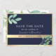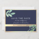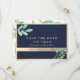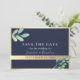This modern boho wedding save the date invitation combines elegant rustic elements with a gold and navy blue colour scheme. Adorned with watercolor eucalyptus greenery and simple calligraphy script, it exudes botanical charm and sophistication, ensuring your special day is remembered in style.