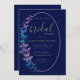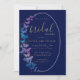 A modern, stylish, romantic bridal shower invitation template with a butterfly theme featuring a boho frame and hand painted, watercolor butterflies in purple, pink and blue hues, gold and a sprinkle of gold (this is also a digital effect, not real foil), over a navy background. It also features modern stylish calligraphy. Romantic and elegant, stylish and chic, it will appeal to the modern bride and groom that want a refined but relaxed atmosphere, perhaps in the countryside, in a garden or other place where nature plays an important role.