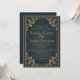 Luxurious navy blue and gold wedding invitation with ornate vintage corners and classic typography, featuring fully editable couple names, ceremony date, time, venue, and reception details for a sophisticated black tie celebration.