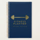A chic and modern fitness planner to plan and track your fitness journey and success, featuring a faux gold fitness weight icon, "fitness planner" and your name, also in gold. The background is in navy blue.